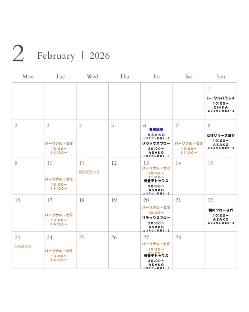 ※②セミパーソナル、③パーソナルレッスンはスケジュール以外でも対応可能です。ご都合の合わない場合はご連絡ください。(nipayoga39@gmail.com)